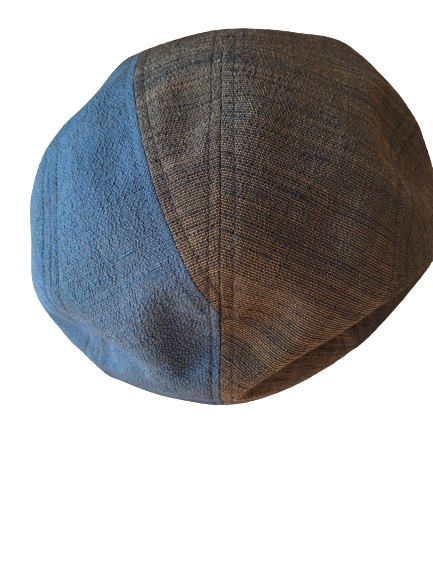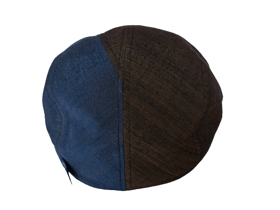 紺色と茶色のお召し紬の生地の切り替えがおしゃれに入り、見る角度によって色々な表情が楽しめもす。